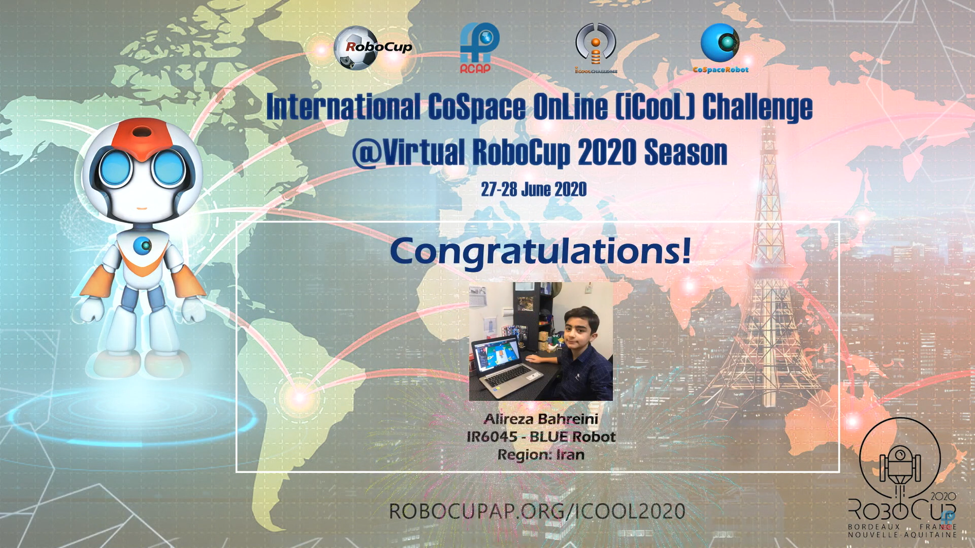 Cospace is a robotics league that is software-based and has no built-in robots. Cospace is basically a rescue robot simulator, which is a competition between 2 teams, and the team that picks up more injured people and brings them to a safe place is the winner.